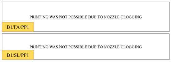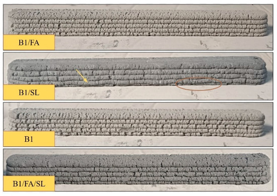 The results of the flow table test, conducted in accordance with the PN-EN 1015-3 standard, demonstrated a gradual decrease in flow diameter over time after the preparation of the mixture. This phenomenon was particularly pronounced in fiber-free mixtures, indicating a reduction in fluidity as time progressed. The type of additive used also significantly influenced the flow characteristics. Mixtures containing fly ash (FA) exhibited higher flow values compared to those incorporating bottom slag (SL), with the latter showing a stronger tendency to limit flow. This behavior can be attributed to differences in density and water absorption properties between fly ash and bottom slag. The incorporation of fibers into the mixtures notably reduced their flowability. The lowest flow diameter values were observed in mixtures containing polypropylene (PP) fibers, particularly at a concentration of 1% by weight. For instance, the B1/FA/PP1 sample exhibited a flow diameter of only 155 mm, the lowest recorded among all tested samples. A lower fiber concentration (0.5% by weight) improved the flowability of the mixture; however, the flow values remained significantly lower than those of the fiber-free mixtures. Mixtures with excessively high flow, such as B1/FA and B1/SL at the initial stage, required a waiting period of 20–40 min before printing could commence, allowing the mixture’s consistency to stabilize. In contrast, mixtures containing fibers, due to their more compact structure, required less waiting time, although their reduced flowability often hindered the proper extrusion process.