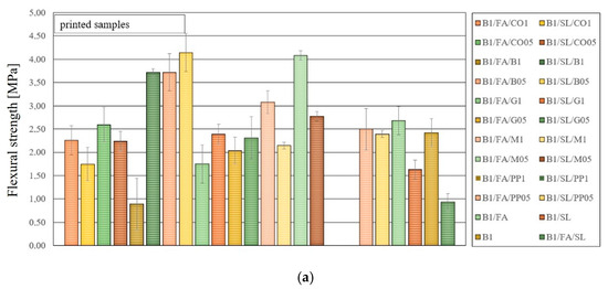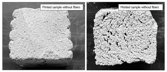 Moreover, the correlation between porosity and mechanical properties suggests that printed samples consistently exhibit lower porosity and smaller pore sizes compared to molded samples, which may contribute to their superior mechanical performance. The refined pore structure in printed samples, particularly those reinforced with specific fibers, likely enhances material densification and structural integrity. This characteristic may explain the relatively high flexural strength observed in these samples. Additionally, the addition of foam in a 1:1 ratio is easier to control during the printing process, allowing for a more uniform pore structure and improved mechanical performance. However, in molded samples, this foam ratio is excessively high, leading to increased porosity and reduced mechanical strength. The presence of larger and more irregularly distributed pores in molded samples creates structural weaknesses, further diminishing their overall performance.