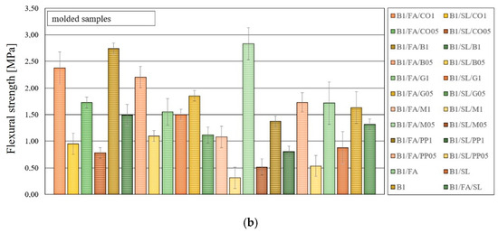 Figure 18 and Figure 19 present selected samples that exhibit significant variations in results between printed and cast specimens. The analysis of pore distribution in printed and molded samples reveals significant differences in porosity and its influence on mechanical properties, particularly compressive and flexural strength. In printed samples, the incorporation of basalt and merino fibers contributes to a more refined pore structure, which may enhance material densification and mechanical performance. The microstructural analysis of the printed sample reinforced with basalt fibers (B1/SL/B05) indicates a uniform distribution of small pores, primarily below 2 µm, as observed in Figure 18a. This lower porosity suggests improved material compactness, which may contribute to the highest compressive strength among the printed samples, reaching 4.14 MPa. Similarly, the printed sample containing merino fibers (B1/FA/M05) exhibits a relatively low porosity, with a pore size distribution concentrated below 2 µm. This refined microstructure is likely to positively influence its mechanical properties, particularly flexural strength, which reaches 4.08 MPa. In contrast, the printed sample without fiber reinforcement (B1/FA) demonstrates a broader pore size distribution, with an increased presence of pores exceeding 2 µm. This higher porosity could be a contributing factor to its lower compressive strength of 2.68 MPa.