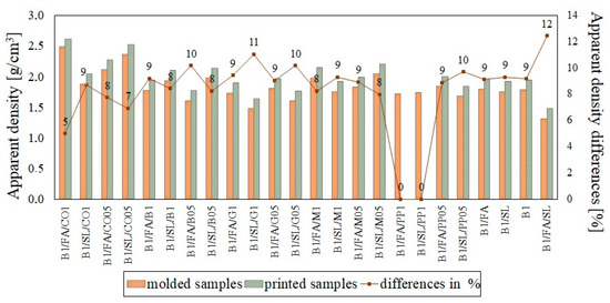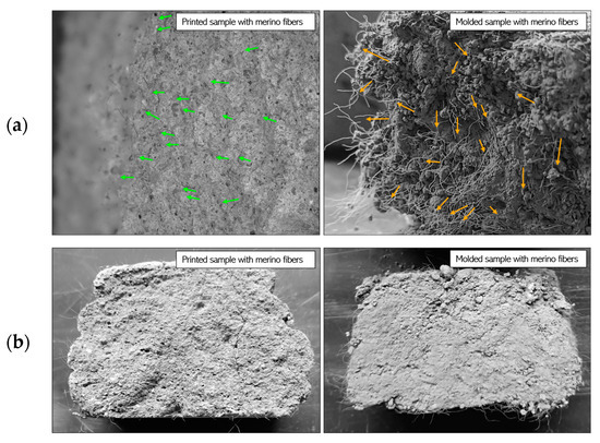 The water absorption behavior demonstrates no direct correlation between the rate of absorption and the total absorption coefficient. For example, materials with larger suction surfaces (e.g., horizontally oriented samples) exhibit faster initial absorption but may reach a lower total capacity. Conversely, materials with smaller suction surfaces absorb water more gradually but retain greater volumes over time. The open-pore structure characteristic of 3D-printed samples accelerates initial water absorption but limits total water retention. This behavior is linked to the higher density of printed samples, which, on average, is 10% greater than that of molded samples, reducing the void space available for water storage. Furthermore, the orientation of printed layers significantly influences water absorption characteristics by dictating the distribution, connectivity, and accessibility of the pore network. Vertically oriented samples, with greater exposure to open pores, facilitate faster water penetration. In contrast, the uniform structure of molded samples reduces initial absorption rates while increasing water retention capacity. Hydrophilic fibers, such as coconut and merino wool, enhance water absorption rates, particularly in printed samples where the open-pore structure facilitates rapid ingress. In contrast, hydrophobic fibers, including basalt, glass, and polypropylene, reduce water absorption rates but do not necessarily limit overall water retention.