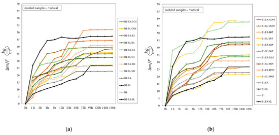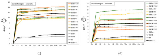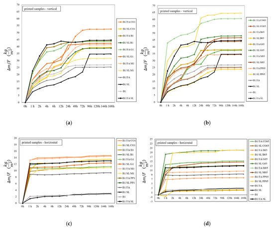 Horizontal sample placement typically results in higher initial water absorption than vertical placement, regardless of the production method. Samples containing hydrophilic fibers, such as merino wool, exhibit markedly higher initial water absorption. For instance, the printed vertical B1/FA/M05 sample absorbs 42.8 kg/m2 within the first hour, significantly exceeding the B1/FA/PP05 sample (15.1 kg/m2). After 12 h, the values increase to 51.1 kg/m2 and 26.1 kg/m2, respectively. By the end of the 7-day testing period, the final absorption for the B1/FA/M05 sample reaches 60.6 kg/m2, compared to 34.4 kg/m2 for the polypropylene-reinforced sample. The higher absorption of merino wool is attributed to its natural hydrophilic properties and high capillarity, which enable rapid water uptake and retention. Conversely, synthetic fibers such as polypropylene (PP), while hydrophobic, exhibit faster initial absorption in printed samples due to the open-pore structure facilitating early water ingress.