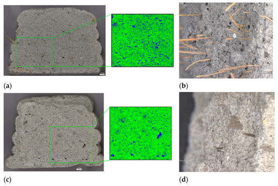 Microscopic analysis was performed using a Techrebal Banito B2920 digital microscope (Techrebal, Wilczyce, Poland) equipped with 100× magnification and a built-in 48 MP camera. This analysis aimed to evaluate the pore architecture of the foamed composites, focusing on the influence of the foaming agent and fabrication technique (3D printing versus conventional casting) on pore geometry, size distribution, and packing density. The micrographs obtained were processed and analyzed using Fiji ImageJ software Version 1.54 to enable a detailed quantitative assessment. This systematic approach provided valuable insights into the effects of production methods on the structural properties of fiber-reinforced foamed concrete. Moreover, understanding the type and distribution of fibers within the composite is critical, as these factors significantly impact the material’s mechanical properties, durability, and overall performance in construction applications.