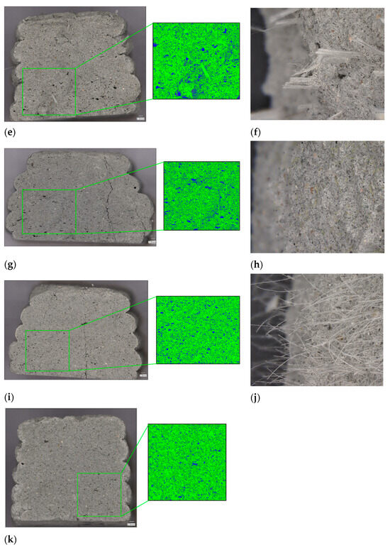 The microscopic images (Figure 17a–k) present cross-sectional analyses of 3D-printed foamed concrete samples reinforced with various fiber types. Sample (a) incorporates coconut fibers, a natural reinforcement material known for its high hydrophilicity and elevated lignin content, which impart flexibility, durability, and resistance to microbial decomposition. However, these fibers exhibit lower tensile and flexural strength compared to synthetic fibers. The natural surface irregularities of the coconut fibers contribute to a heterogeneous pore distribution, particularly in regions adjacent to the fibers, resulting in a non-uniform pore structure that adversely affects the mechanical performance of the material. The fracture surface of the sample (b) illustrates the spatial orientation and fiber distribution induced during the extrusion-based additive manufacturing process. Sample (c) contains basalt fibers, an inorganic reinforcement material renowned for its exceptional tensile strength, thermal stability, and low water absorption capacity. These properties promote effective fiber–matrix adhesion, thereby minimizing interfacial void formation. Consequently, the pore architecture in this sample is notably more homogeneous compared to coconut fiber-reinforced composites. The fractured image of sample (d) confirms the consistent dispersion of basalt fibers, which are observed to localize in distinct regions due to the flow dynamics of the printing process. Sample (e) incorporates glass fibers, characterized by their smooth surface texture, which reduces their potential for capillary water absorption and limits interfacial bonding with the cementitious matrix. This results in moderate flexural strength and a relatively low water absorption coefficient. The pore structure, marked by irregular geometries, correlates with these fiber–matrix interactions.