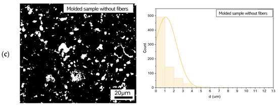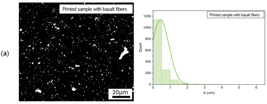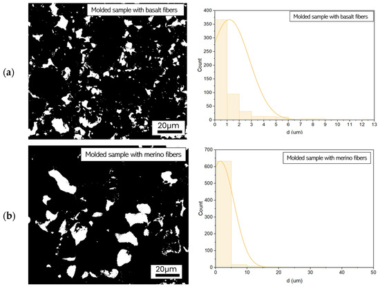 In molded samples, the pore distribution differs substantially, with a notable increase in both pore size and heterogeneity, which negatively impacts mechanical properties. The molded sample containing basalt fibers (B1/SL/B05) exhibits significantly larger pores, some exceeding 10 µm, as shown in Figure 19a. This higher porosity may be responsible for its reduced compressive strength of 3.21 MPa compared to its printed counterpart. The molded sample reinforced with merino fibers (B1/FA/M05) presents an even broader pore size distribution, with pores exceeding 20 µm. This increased porosity likely contributes to a further reduction in compressive strength, reaching 2.80 MPa. The most pronounced porosity is observed in the molded sample without fibers (B1/FA), where numerous macropores larger than 10 µm are evident. Such an irregular and porous structure leads to the lowest recorded compressive strength of 1.72 MPa.