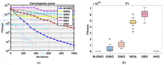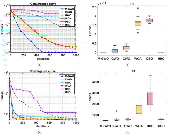 The statistical values in Table A1, Table A2, Table A3 and Table A4 indicate that the M-GWO has better optimization capabilities compared to other algorithms. The M-GWO utilizes different location update strategies to effectively enhance optimization capability. Firstly, the position update for alpha wolves adopts the sine cosine function update method. Due to the best fitness of alpha wolves, the improved update scheme can enable them to better explore the nearby locations of individuals. Then, Gaussian mutation and Cauchy mutation were used in the position update formula for the wolf. The use of mutation operators can improve individual development ability, and individual mutation can break away from local optimal value.