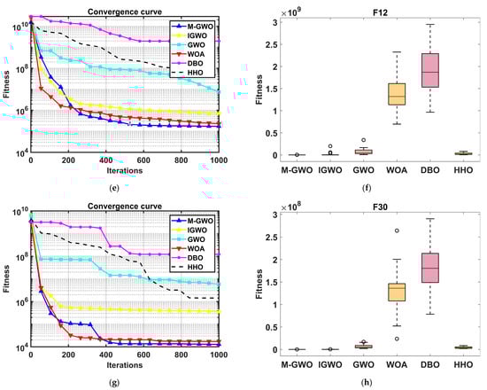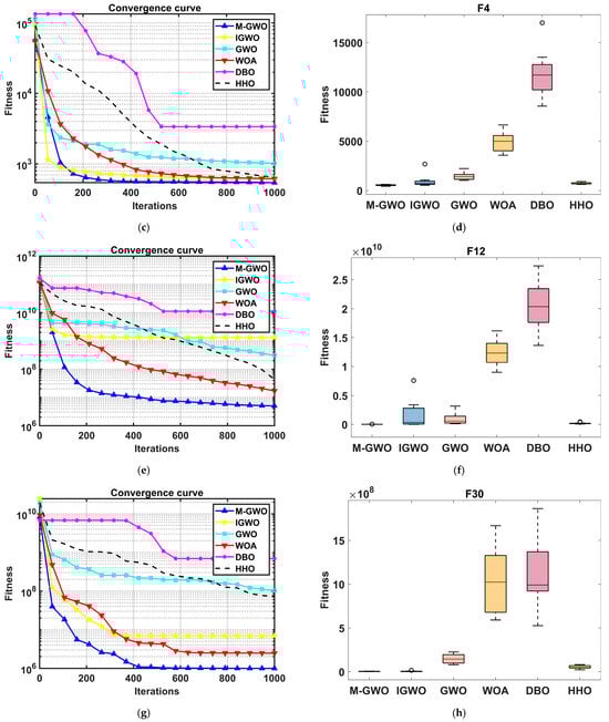 Partial convergence curve and box plot in 30 dimensions: (a) F1 convergence curve; (b) F1 box plot; (c) F4 convergence curve; (d) F4 box plot; (e) F12 convergence curve; (f) F12 box plot; (g) F30 convergence curve; (h) F30 box plot.