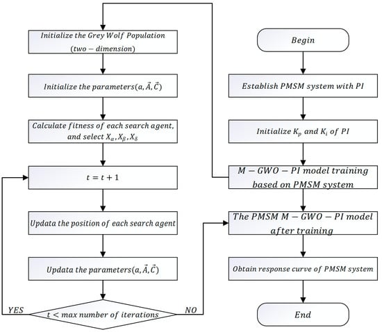 The parameter optimization process of M-GWO for the current loop PI controller of the PMSM system.
