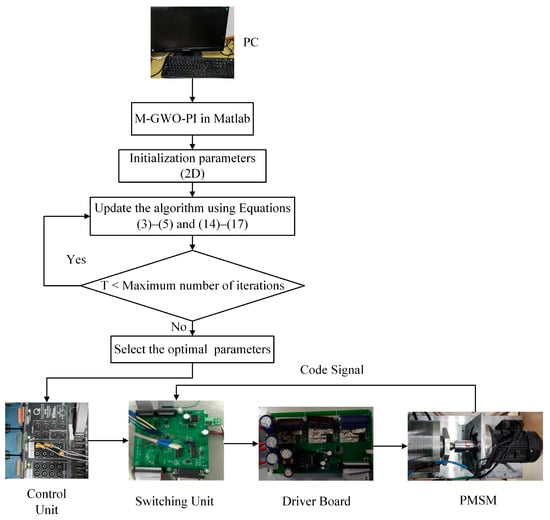 For motor control, the current loop is the most internal system of the motor. The tracking accuracy of the current loop is very important, and is related to the overall performance of the motor. The smaller the current-tracking error fluctuation value of the q-axis and d-axis, the better. At present, the parameters of the PI controller added to the current loop are usually obtained through the empirical method. The empirical method can only meet the general conditions and cannot make the system have enough control accuracy. Therefore, it is important to select the appropriate PI controller parameters in the current loop. Figure 4 shows the parameter optimization process of the M-GWO for the current loop PI controller of the PMSM system. Figure 5 shows the actual parameter optimization control system. The control unit is a 32-bit floating-point DSP processor that contains TMS320F28335 and is used to implement three-phase PWM inverter processing. A STC15W10X single-chip microcomputer plays an important role as the switching unit. The manufacturer of this device is Hardman Technology in Jiande, China. The signal from the controller is transmitted to the switching board and then to the driving board. The driving board transmits the electrical signal to the PMSM system for driving. The current situation of the PMSM system is transmitted to the converter board through the encoder adapter, and then to MATLAB for data preservation.
