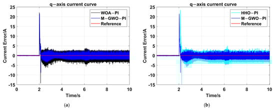 The comparison of the d-axis current-tracking error between the M-GWO-PI method and WOA-PI method, and M-GWO-PI method and HHO-PI method are shown in Figure 7. During the start-up phase, the current response speed of M-GWO-PI is faster than that of WOA-PI and HHO-PI. Figure 7c,d shows that when subjected to disturbance, the method of the M-GWO-PI can exhibit smaller current fluctuations compared to other methods. The d-axis current fluctuations of WOA-PI and HHO-PI are greater, with peak fluctuations reaching 4 A. Figure 7e,f shows that at around 9 s, there is a click on the motor to reach the stable stage of operation. The q-axis current of the M-GWO-PI in the stable stage is about −2~2 A, while the d-axis currents of WOA-PI and HHO-PI are both around −2~3 A.