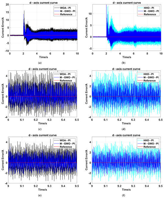 The -axis current-tracking error between the different algorithms: (a) Comparison between WOA-PI and M-GWO-PI; (b) Comparison between HHO-PI and M-GWO-PI; (c) Interference points between WOA-PI and M-GWO-PI; (d) Interference points between HHO-PI and M-GWO-PI; (e) Stability between WOA-PI and M-GWO-PI; (f) Stability between HHO-PI and M-GWO-PI.