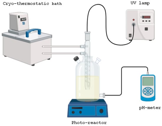 The experiments were conducted using a photocatalytic reactor equipped with a 150 W medium-pressure mercury lamp (Heraeus, 85.8 V, 148.8 W, 1.79 A, 95% transmittance within the 300–570 nm wavelength range) and a magnetic stirrer (Figure 1). The reactor temperature was maintained at a constant 30 °C using a recirculating cooling bath (Frigiterm-P, Selecta, Barcelona, Spain). Photocatalytic oxidation experiments were performed by introducing 1.0 L of an aqueous sulfamethoxazole solution (50.0 mg/L; SMX, Fragon, Rotterdam, The Netherlands; C10H11N3O3S) into the reactor. Subsequently, varying initial concentrations of ferrous ion [Fe(II)]0 = 0–5.0 mg/L (Panreac, FeSO4·7H2O, 99%) were added to investigate their catalytic effect. The pH of the solution was adjusted to 3.0 by adding a few drops of 0.1 M hydrochloric acid (Panreac, Castellar del Vallès, Spain; HCl, 37% v/v), and monitored using a pH meter (Kent EIL9142, Cambridge, UK). At this stage, baseline measurements were recorded for SMX concentration, color, turbidity, and aromaticity. The UV lamp was then switched on, initiating the reaction, followed by the addition of hydrogen peroxide at an initial concentration of [H2O2]0 = 2.0 mM (Panreac, Castellar del Vallès, Spain; H2O2, 30% w/v). The photocatalytic process was carried out for 120 min, during which time sequential measurements of water quality parameters were taken to monitor the progression of the reaction.
