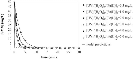 Predictions of the first-order kinetic model for SMX oxidation by photo-Fenton. Experimental conditions: [SMX]0 = 50.0 mg/L; [H2O2]0 = 2.0 mM; [UV] = 150 W; [pH]0 = 3.0; [T] = 25 °C.