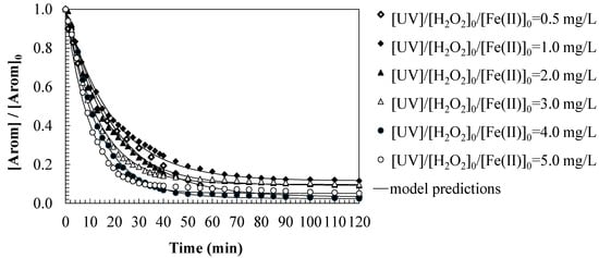 From the fits, the value of the first kinetic constant for the loss of aromaticity was estimated as a function of ferrous ion concentration (Equation (11)). Table 1 shows the estimated kinetic parameters.
