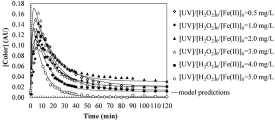 From the experimental results obtained, the kinetic parameters of the proposed equation have been adjusted, obtaining the values shown in Table 2. The estimates made allow us to verify that as the Fe(II) concentration increases, the rate of color formation and removal also increases, suggesting a greater generation of hydroxyl radicals that attack the compounds responsible for the coloration (Equations (15) and (16)). The dependence of the α parameter (Equation (17)) and the initial and final color of the treated water (Equation (18)) on the catalyst concentration used has also been estimated.