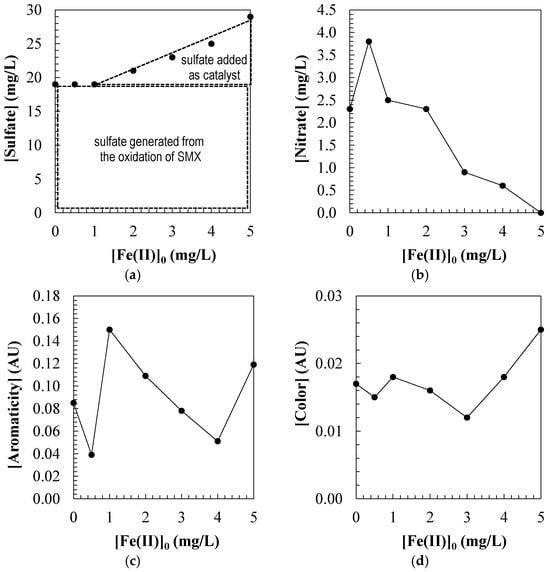 (a) Sulfate; (b) nitrate; (c) aromaticity; (d) color measured in the SMX aqueous solutions treated by photo-Fenton. Experimental conditions: [SMX]0 = 50.0 mg/L; [H2O2]0 = 2.0 mM; [UV] = 150 W; [pH]0 = 3.0; [T] = 25 °C.