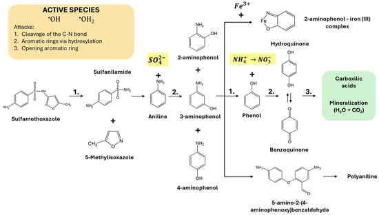 The process of sulfate formation during SMX oxidation involves several chemical reactions, mainly related to the degradation of the SMX heterocyclic ring and the oxidation of the sulfonamide group, which releases sulfate ions as the final product upon complete oxidation. Hydroxyl radicals attack the SMX molecule at different positions, including the sulfonamide group, and oxidized intermediate species such as sulfinic and sulfonic acids, and finally, sulfate ions, are produced.