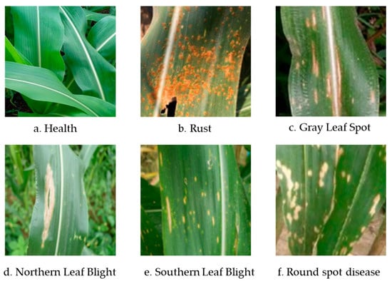 Original dataset: (a) healthy, (b) rust, (c) gray leaf spot, (d) northern leaf blight, (e) southern leaf blight, and (f) round spot disease.