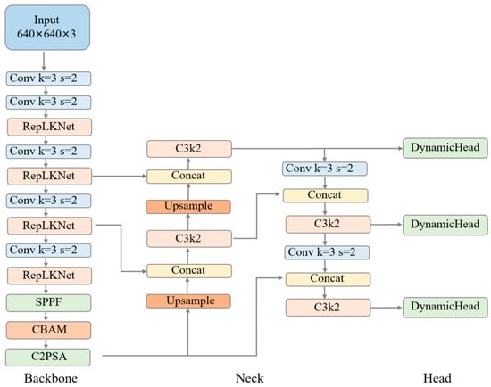 - In the backbone layer, we replace the C3k2 backbone network with the RepLKNet network, improving detection performance and efficiency through re-parameterization;