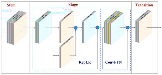 In complex scenarios characterized by interference and overlapping foliage, the textural features of diseased areas on maize leaves exhibit a high degree of complexity, posing significant challenges for accurate detection of these diseased regions. Therefore, this study introduces RepLKNet as the backbone network to enhance the model’s precision in detecting maize diseases in contexts of overlapping and occluded backgrounds []. RepLKNet significantly improves feature extraction performance by expanding the effective receptive field (ERF) and enhancing the model’s capability to extract shape information. The ERF, based on a quantitative metric proposed by Luo et al. [], characterizes the contribution of each input pixel within the receptive field to the output of the n-th layer unit in the network. Figure 3 depicts RepLKNet, which primarily comprises three core modules: Stem, Stage, and Transition. The first of these is responsible for initial feature extraction, the second achieves multi-level feature learning by cascading multiple large kernel convolution sub-modules, and the third down-samples feature maps and adjusts the number of channels. Using RepLKNet with a larger effective receptive field allows the model to effectively extract global contextual information and local detail features from input images, demonstrating significant advantages, particularly when used with complex scenes of maize leaf diseases including shadow interference and overlapping foliage.