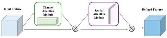 This study introduces the CBAM to improve the model’s feature representation capability. This module integrates both channel and spatial attention mechanisms, providing the model with comprehensive and effective feature extraction capabilities []. Figure 4 and Figure 5 depict the core idea of the CBAM, which aims to refine the input feature map in two stages: first, by refining the dependencies among channels using the channel attention module (CAM), and then by enhancing features along the spatial dimension using the spatial attention module (SAM).
