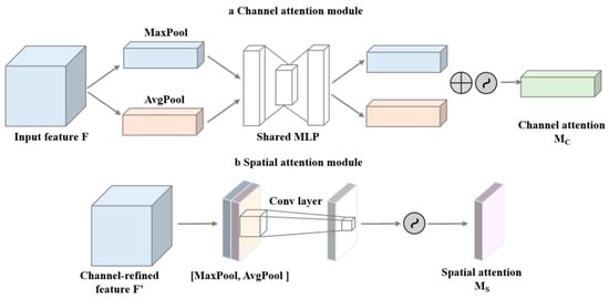 where [AvgPool (F); MaxPool (F)] is the concatenation of the average pooling and the max pooling results along the channel axis, and f7×7 indicates a 7 × 7 convolution operation. This two-stage attention mechanism allows the CBAM to effectively capture essential information in the feature map’s channel and spatial dimensions, thereby enhancing the model’s ability to perceive key features.