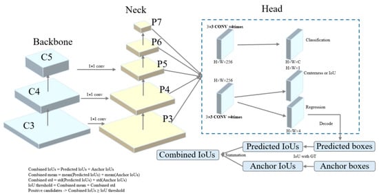 This paper employs a straightforward yet highly effective dynamic label assignment strategy called Dynamic ATSS, which incorporates predictions into the label assignment process for anchors (Figure 7) []. In the initial stages of training, predictions tend to be inaccurate owing to random initialization. Therefore, as in previous methods, the anchors are defined by label indications. However, as training progresses and predictions improve, the predictions progressively take precedence over the combined Intersection over Union (IoU), leading to more refined label assignments. This strategy provides dynamic label assignment determined by the training state and the corresponding predictions.