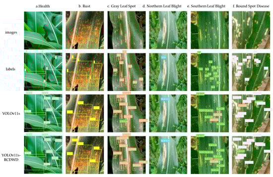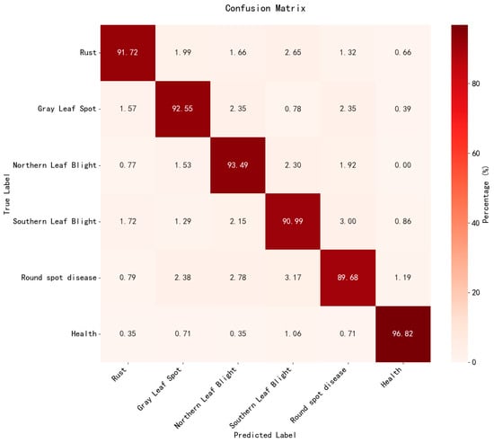 The experimental results indicate that the improved YOLOv11s-RCDWD model achieved generally high accuracy in identifying different disease categories, particularly in recognizing healthy leaves, for which its accuracy rate was 96.82%. Its recognition accuracy for northern leaf blight and gray leaf spot is also relatively high, reaching 93.49% and 92.55%, respectively. However, the model exhibited some confusion in distinguishing between round spot disease and southern leaf blight, with accuracy rates of 89.68% and 90.99%, respectively. This may be attributed to the potential visual similarity between these two diseases, leading to misclassification by the model when differentiating between them.