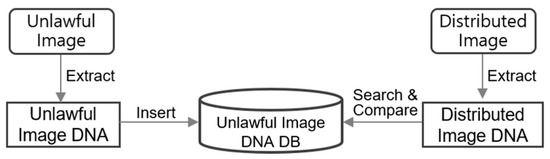 The process of filtering unauthorized images involves the steps illustrated in Figure 2. First, DNA is extracted from the filtering target images and stored in a searchable DNA database. This database can either be prepopulated with unauthorized images or updated incrementally as needed. For filtering, the DNA of distributed images is extracted, compared against the database, and analyzed for similarity to detect unauthorized content.