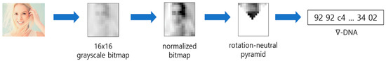 This study adopts a bitmap-based image DNA method termed Nabla DNA (∇-DNA) [13], which converts image bitmaps into a reverse-pyramid structure. As illustrated in Figure 3, the method normalizes the brightness, color, and resolution of an image bitmap. It then segments the bitmap into quadrants along the diagonal, averaging pixel intensities within triangular regions to create a rotation-neutral vector representation.