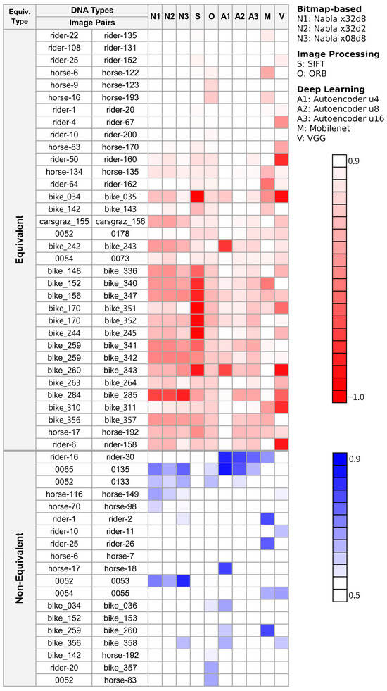 DNA similarity heatmap for equivalent and non-equivalent image pairs. Cell colors transition from red (−1.0) to white (0.9) for equivalent pairs and from blue (1.0) to white (0.5) for non-equivalent pairs, representing increasing and decreasing DNA similarity, respectively. Cells exceeding 0.9 in red or below 0.5 in blue do not display gradients.