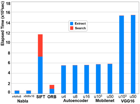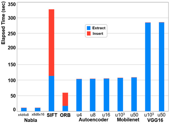 Notably, the bitmap-based Nabla method required only 3.5 ms per image for DNA extraction, even when additional DNA was generated for vector indexing. Similarly, the image processing-based ORB method achieved an extraction time of approximately 5.9 ms per image. However, when accounting for the large number of feature vectors generated per DNA, the total time, including database insertion, increased to approximately 20 ms.