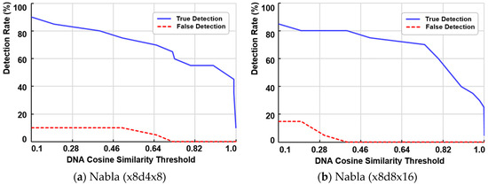 To quantitatively compare the detection accuracy of each technique, the detection rates were evaluated using 20 transformed images from the COCO dataset. Figure 8 plots the true detection rate (TDR) and false detection rate (FDR) for the bitmap-based Nabla method as a function of the cosine similarity threshold between DNA vectors. The results show that increasing the threshold reduces both the TDR and FDR.