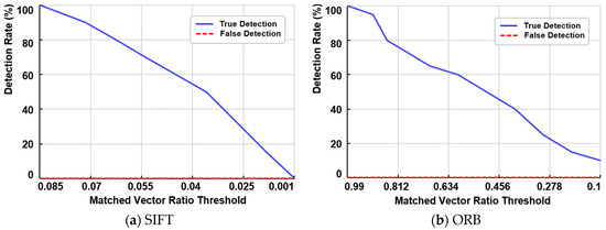 Figure 9 shows the trends in the True Detection Ratio (TDR) and False Detection Ratio (FDR) for the image processing-based methods SIFT and ORB. Both methods used the Matched Vector Ratio (MVR) to determine thresholds, and the results indicate that FDR remained exceptionally low across all threshold values. This is because image processing-based methods generate hundreds of feature vectors per DNA, and the likelihood of feature vectors from non-equivalent DNA matching those of transformed DNA is extremely rare. However, compared to bitmap-based methods, the TDR for image processing-based methods decreases more sharply as the threshold increases, making it relatively more challenging to determine an optimal threshold for deployment.