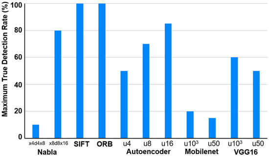 Figure 11 illustrates the maximum achievable TDR for each method across the 20 types of image transformations in Table 2. As shown in the figure, image processing-based methods achieved the highest detection rates for all image cases we considered. In contrast, low-resolution Nabla (x4d4x8) and the lightweight MobileNet network achieved TDRs below 20%, making them unsuitable for filtering systems. However, high-resolution Nabla (x8d8x16) achieved a TDR of 80%, demonstrating the potential of bitmap-based methods despite their simplicity.