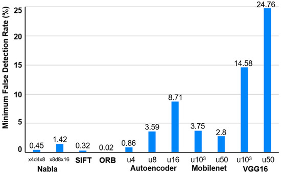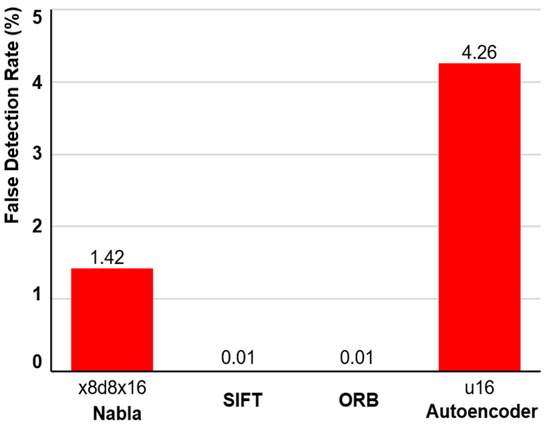Given the trade-off between the TDR and FDR, Figure 13 evaluates the FDR for each method when the TDR is fixed at 80%. Only four methods achieved a TDR of 80%, and their results are presented. Despite being a bitmap-based method, Nabla (x8d8x16) achieved an acceptable FDR at minimal cost. While Autoencoder demonstrated a low FDR for the limited dataset, it showed a higher tendency for false detections when handling untrained images, resulting in higher FDRs compared to other methods.
