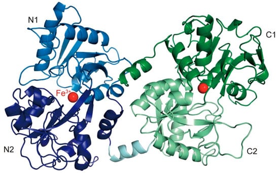 Lactoferrin (Lf) is one of the main proteins of mammalian milk whey [1]. Typically, human milk contains approximately 1–2 mg/mL Lf, whereas cow’s milk contains 1–10 µg/mL [2]. It was first reported in 1939 [3] and was subsequently isolated and found to have a similar structure to serum transferrin [4]. It is a glycoprotein consisting of one polypeptide chain with a molecular weight of 80 kDa [1]. Human Lf consists of 691 amino acids, whereas bovine Lf comprises 696 amino acids [5]. The two globular lobes, carboxyl (C) and amino (N), are joined by an alpha-helix and comprise two domains, C1 and C2, N1 and N2, folded into a beta-sheet [1,5]. The structure visualisation is shown in Figure 1. Each lobe can bind one ferric ion, creating a closed holo-Lf, but when no iron is bound, it creates the open-form apo-Lf [6]. Its positive charge facilitates binding to anionic compounds [5]. Its sensitivity to proteolysis and denaturation is determined by the number of glycosylation sites and their location [7].