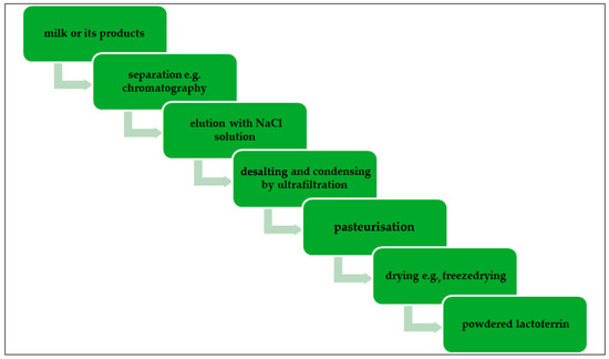 Commercially, Lf is currently isolated from bovine milk or its by-products primarily due to its good availability and relatively low costs. However, Lf can be isolated from any mammalian secretion [81], and recombinant human Lf has been produced in transgenic animals, fungi, cell cultures, or plants [87,88]. However, Lf production from bovine milk is expensive due to the large volume of milk or its products required for the chromatographic and ultrafiltration techniques [89]. To purify Lf to supplement grade, milk or other dairy products must undergo an extraction process. The pulled-out Lf is then eluted with a solution of NaCl, then desalted and condensed by ultrafiltration. The obtained product must then be pasteurised and dried to create a powder (Figure 2).
