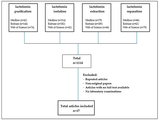 The databases Medline, Embase, and Web of Science were searched up to the 12th of March 2025 using the following phrases: “lactoferrin” and “purification” or “isolation” or “extraction” or “separation”. Inclusion criteria were English language, original research, and publication after 2019. Duplicates were ruled out. The exclusion criteria were no laboratory examination described in the article, absence of sample preparation report or conditions parameters, and using different product other than milk or milk-derived (Figure 3). All authors independently assessed the full-text articles, and agreement was reached among all authors on the articles included for review.