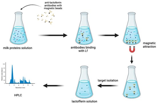 Pang et al. described a method using immunoaffinity magnetic purification coupled with high-performance liquid chromatography-fluorescence (HPLC-FL) detection for the determination of Lf in dairy products (pasteurised milk, infant formula powder, whey protein concentrate). This method is more sensitive (curve range 0.8–30 µg/mL) than the HPLC-UV method (10–1200 µg/mL). Additionally, in comparison to LC-MS/MS, where the sensitivity is higher (1–1000 nM), it is possible to distinguish intact Lf from its denatured form. This method is simple, specific, and sensitive, but not suitable for yoghurt because its pH is not conducive to immunoaffinity binding [99]. This method is shown in Figure 4.