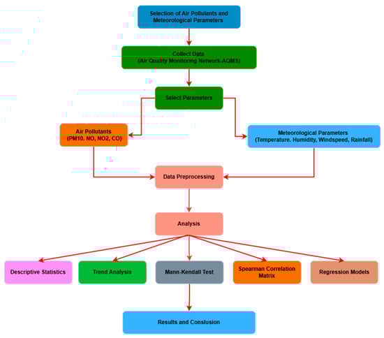 This study employs a systematic framework to analyze the relationship between air pollutants and meteorological parameters. The methodology integrates data preprocessing, statistical analyses, and machine learning techniques to ensure a comprehensive and reliable evaluation of air quality dynamics. The key steps of the methodology are as follows: