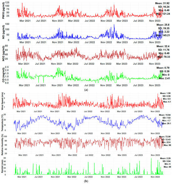 The datasets span from 1 January 2021 to 31 December 2023, providing a robust temporal framework to examine seasonal and annual trends. The air quality and meteorological data were carefully preprocessed to ensure reliability and consistency. Preprocessing steps included addressing missing values, standardizing formats, and synchronizing measurement intervals, ensuring the datasets were suitable for advanced statistical and machine learning analyses.