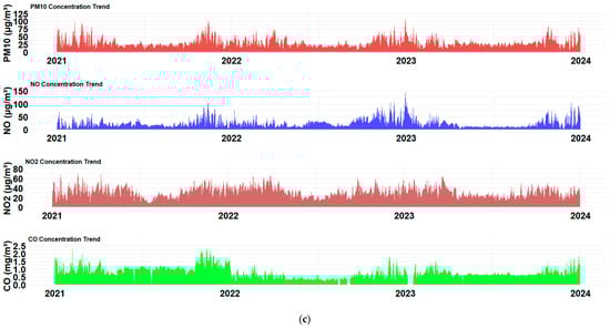 Figure 3c provides a comparative visualization of the temporal trends of NO2, NO, CO, and PM10 concentrations. The significant reductions in NO2 and CO concentrations reflect the success of emission control measures. In contrast, PM10 levels show subtle fluctuations with a slight upward tendency, emphasizing the need for enhanced strategies to address particulate matter pollution effectively.