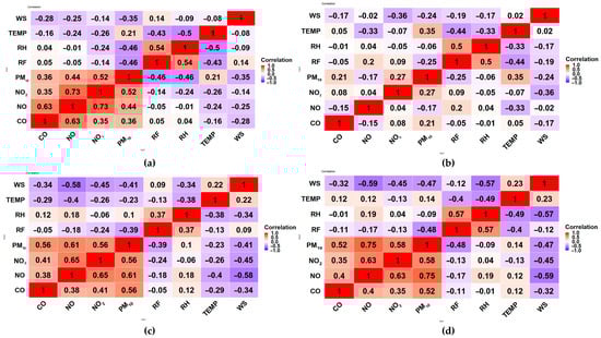 The preprocessed datasets were aligned across consistent time intervals to ensure robust and reliable results. Seasonal variations in correlations were also analyzed to capture how pollutant–meteorological relationships vary under different climatic conditions. For instance, WS was found to play a critical role in pollutant dispersion during winter, while RainF had a stronger influence on pollutant removal during spring and summer.