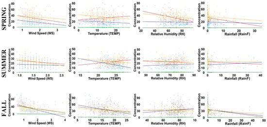 WS consistently exhibited a negative correlation with PM10, with the strongest impact observed during winter (r = −0.47) and fall (r = −0.41). These results highlight WS’s role in dispersing particulate matter, especially during colder months when atmospheric stability often limits natural dispersion. Similarly, WS showed strong negative correlations with NO in fall (r = −0.58) and winter (r = −0.59), further emphasizing its critical role in pollutant dispersion under stable atmospheric conditions. Conversely, its influence on NO2 and CO was minimal, reflecting these pollutants’ lower sensitivity to dispersion dynamics.