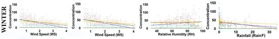RH exhibited dual effects depending on the season. In spring, RH negatively correlated with PM₁₀ (r = −0.46), likely due to enhanced wet deposition. However, in fall and winter, RH showed weak positive correlations with NO (r = 0.18 and r = 0.19, respectively), potentially promoting nitrogen oxide accumulation in colder, more humid conditions. These seasonal shifts underline RH’s dual role in both pollutant removal and atmospheric chemical transformations.