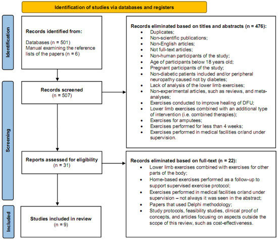The search process initially identified a total of 507 papers. Of these, 501 articles were retrieved through searches conducted in six electronic databases: PubMed, Web of Science (Core Collection), Cochrane Library, EBSCO (Rehabilitation and Sports Medicine Sources), Scopus, and ScienceDirect, yielding 149, 129, 154, 51, 18, and 0 articles, respectively. An additional six papers were identified by analyzing the reference lists of articles included in this review. Following this, 31 full-text articles were selected and assessed for eligibility. Ultimately, nine articles met the inclusion criteria and were included in this review (Figure 1).