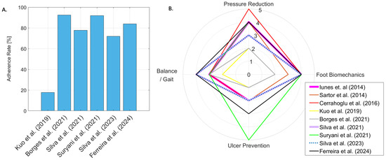(A). Adherence rates (%) for home-based lower limb exercise interventions reported in the reviewed studies [16,17,18,19,20,21] (B). Comparative effectiveness of interventions based on outcomes, including foot biomechanics, plantar pressure, gait/balance, and ulcer recurrence. Each intervention is scored on a 1–5 scale based on a qualitative synthesis of the results reported in the reviewed studies [13,14,15,16,17,18,19,20,21].