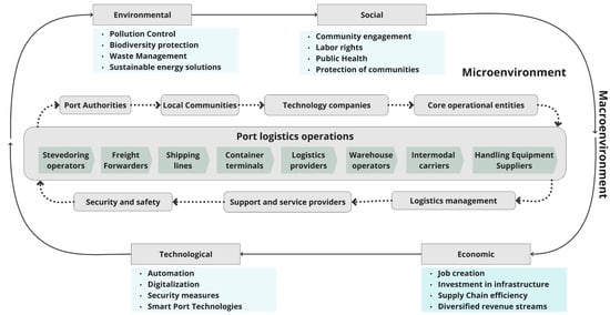 Smart management and strategic collaboration across supply chains are essential in today’s competitive landscape, where entire supply networks, rather than individual companies, vie for dominance []. As shown in Figure 1, port companies operate within a complex network of private and public stakeholders, each performing key operational and logistical functions. The port industry is a complex and interconnected ecosystem that facilitates synergies in the physical flow of cargo, as well as information and communication across economic, social, technological and environmental dimensions (Microenvironment and Macroenvironment) []. These synergies are critical to driving innovation and sustainability in the port industry.
