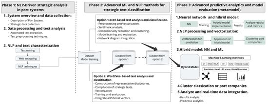 Ports play a critical role in national economic development, not only by facilitating the movement of goods, but also by shaping local economies, environmental policies and international relations [,]. In a globalized and dynamic environment, integrating innovation and sustainability into strategic decision-making is essential to ensure long-term competitiveness []. In this context, advanced techniques in natural language processing (NLP) and machine learning (ML) have emerged as key tools for analyzing strategic texts and optimizing risk and resource management [,].