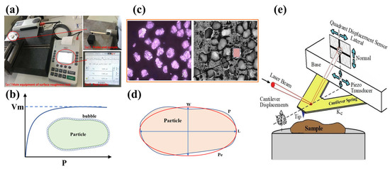 The measurement methods of the surface roughness of particles: (a) the surface roughness measurer [24]; (b) the BET method; (c) the optical profilometer [25]; (d) the fitting ellipse method; and (e) the AFM [26].